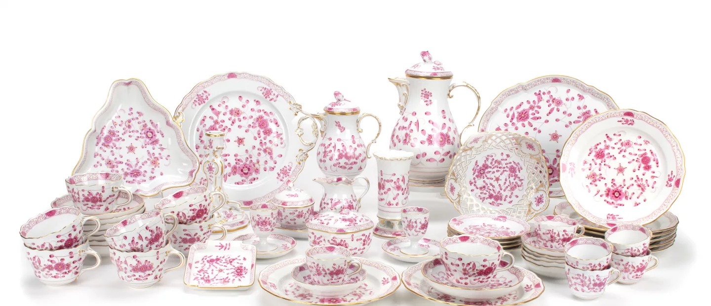 Meissen Kaffee- und Mokkaservice 'Indisch purpur' reiche Malerei: 56-tlg., Meissen, 2. Hälfte 20. Jh., Porzellan, weiß,...