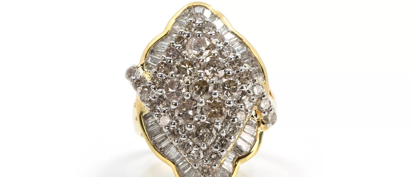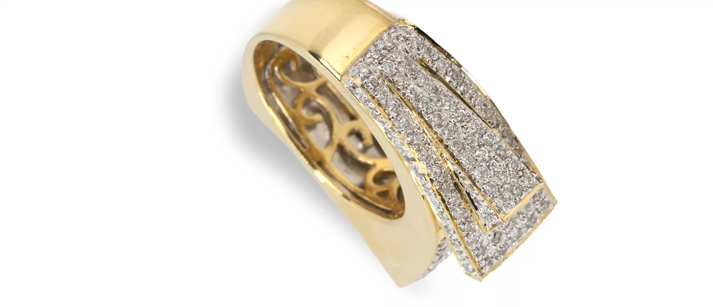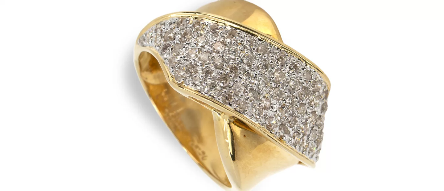 Diamantring: 750 Gelbgold, punziert, 158 Diamanten im Brillantschliff, gesamt 1,10 ct, punziert, H, vs-pi, RW 56, Gewicht ca. 16,7 g,...