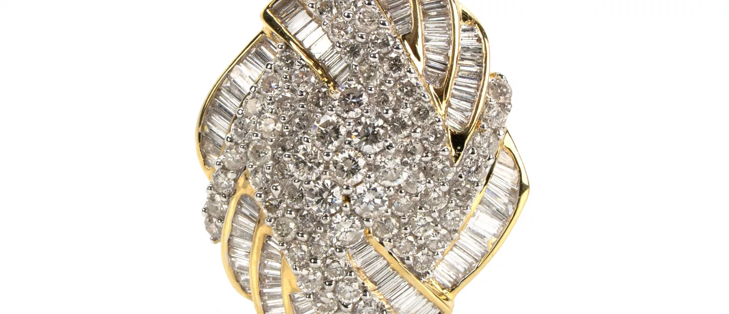 Diamantring: 750 Gelbgold, punziert, 37 Diamanten im Brillantschliff und 40 Diamanten im Trapez- und Baguetteschliff, gesamt 3,18 ct,...