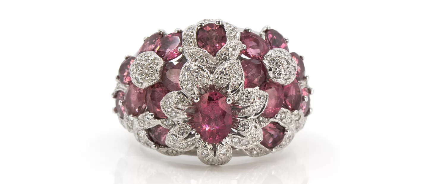 Turmalin-Diamantring: 585 Weißgold, punziert, 95 Diamanten im Brillantschliff, gesamt ca. 0,49 ct, 18 pinkfarbene Turmaline im...