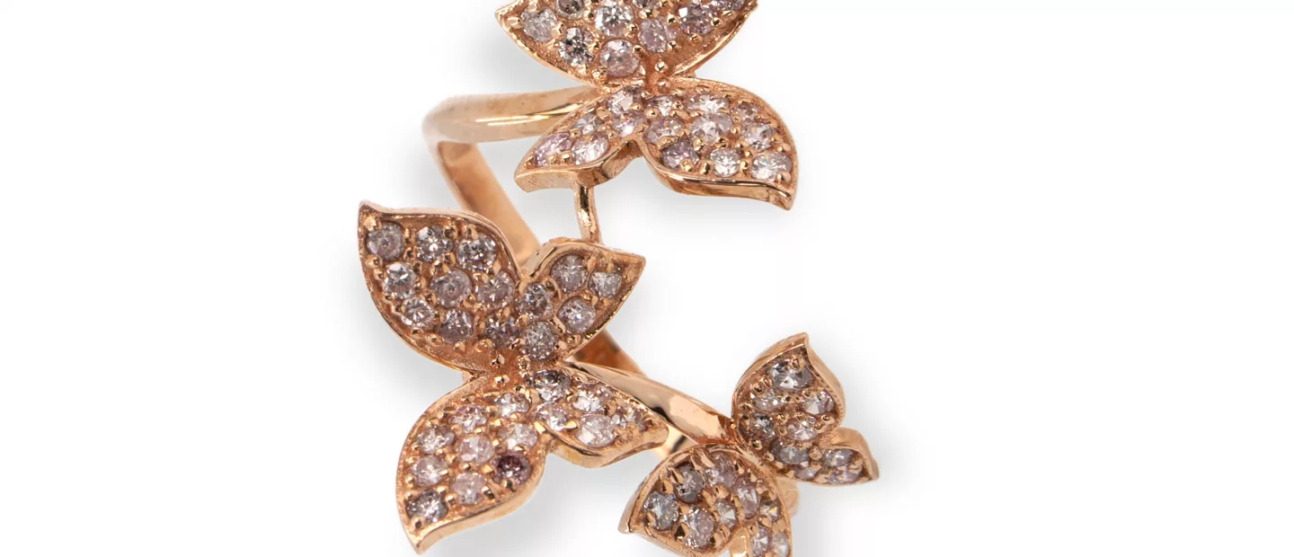 Schmetterlingsring: 585 Roségold, punziert, 74 Diamanten im Brillantschliff, gesamt 1,01 ct, pink, si1-pi1, RW 56, Gewicht ca. 3,3 g,...