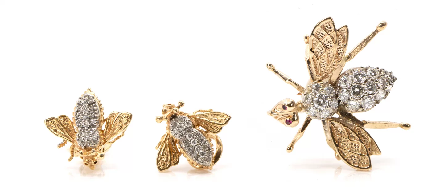Bienenbrosche und Ohrstecker: 3-tlg., Brosche 585 Gelb- und Weißgold, geprüft, Ohrstecker 585 Weiß- und Gelbgold, punziert, Brosche...