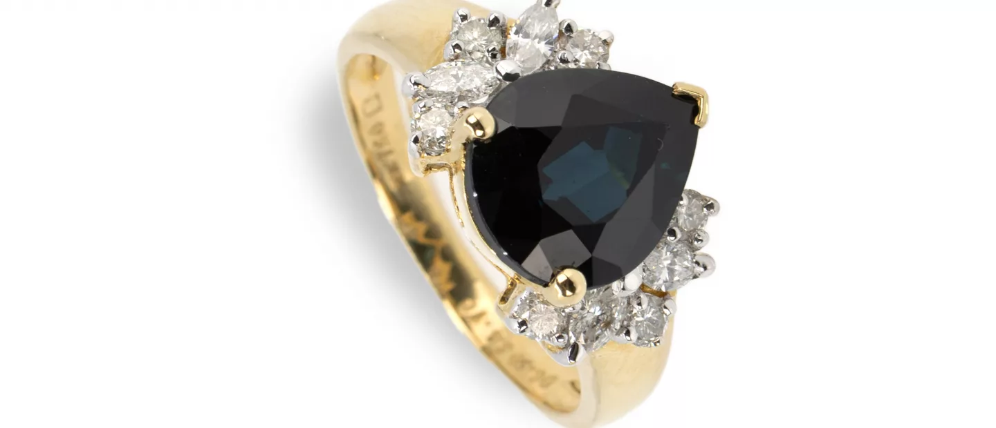 Saphir-Diamantring: 750 Gelbgold, punziert, 10 Diamanten im Brillant- und Navetteschliff, gesamt 0,50 ct, punziert, H, si-pi, Saphir im...