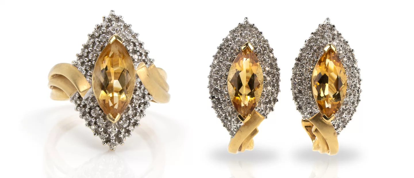 Citrin-Diamant-Schmuckset: 3-tlg., 750 Gelb- und Weißgold, punziert, Ohrclips mit insgesamt 84 Diamanten im Achtkantschliff, gesamt...