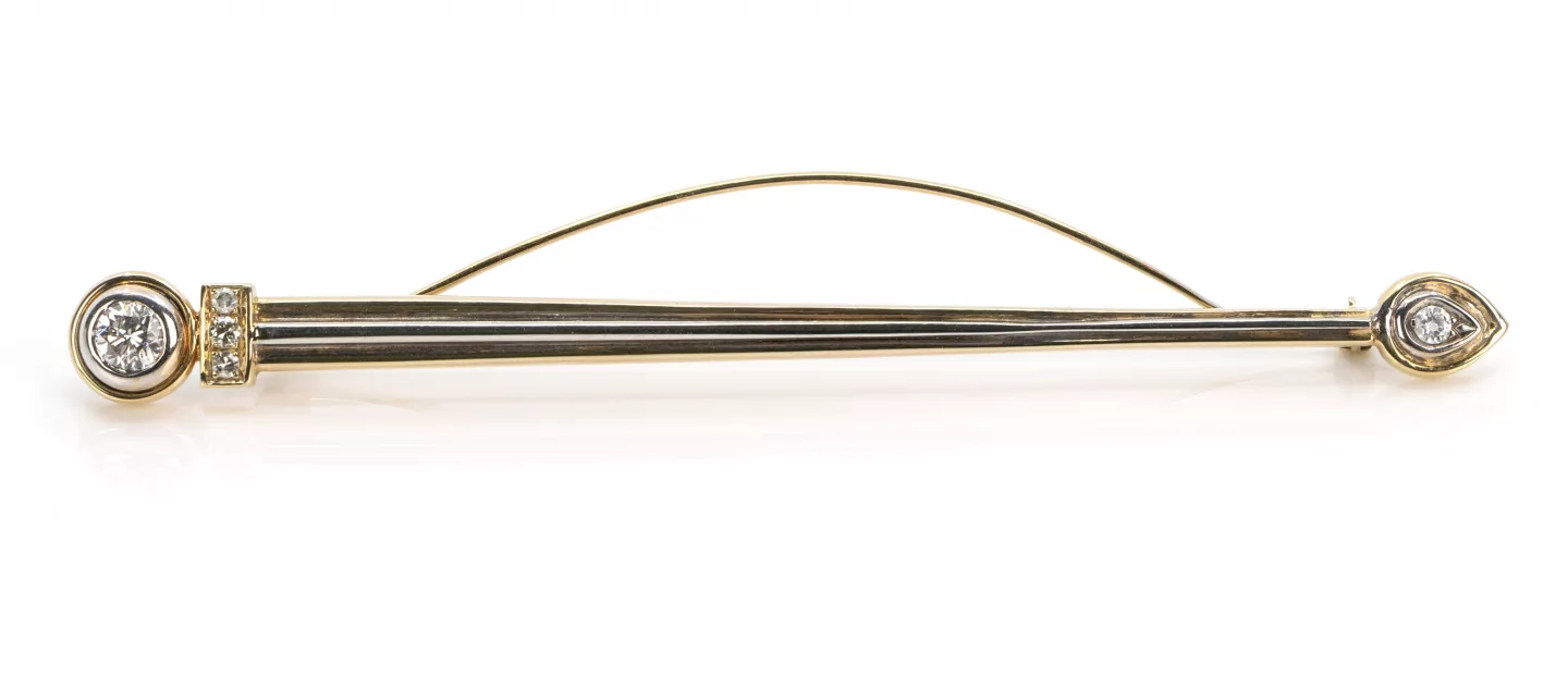 Diamant-Stabbrosche: 585 Gelb- und Weißgold, geprüft, 5 Diamanten im Brillantschliff, gesamt ca. 0,72 ct, I-K, si-pi, Länge 10,5 cm,...