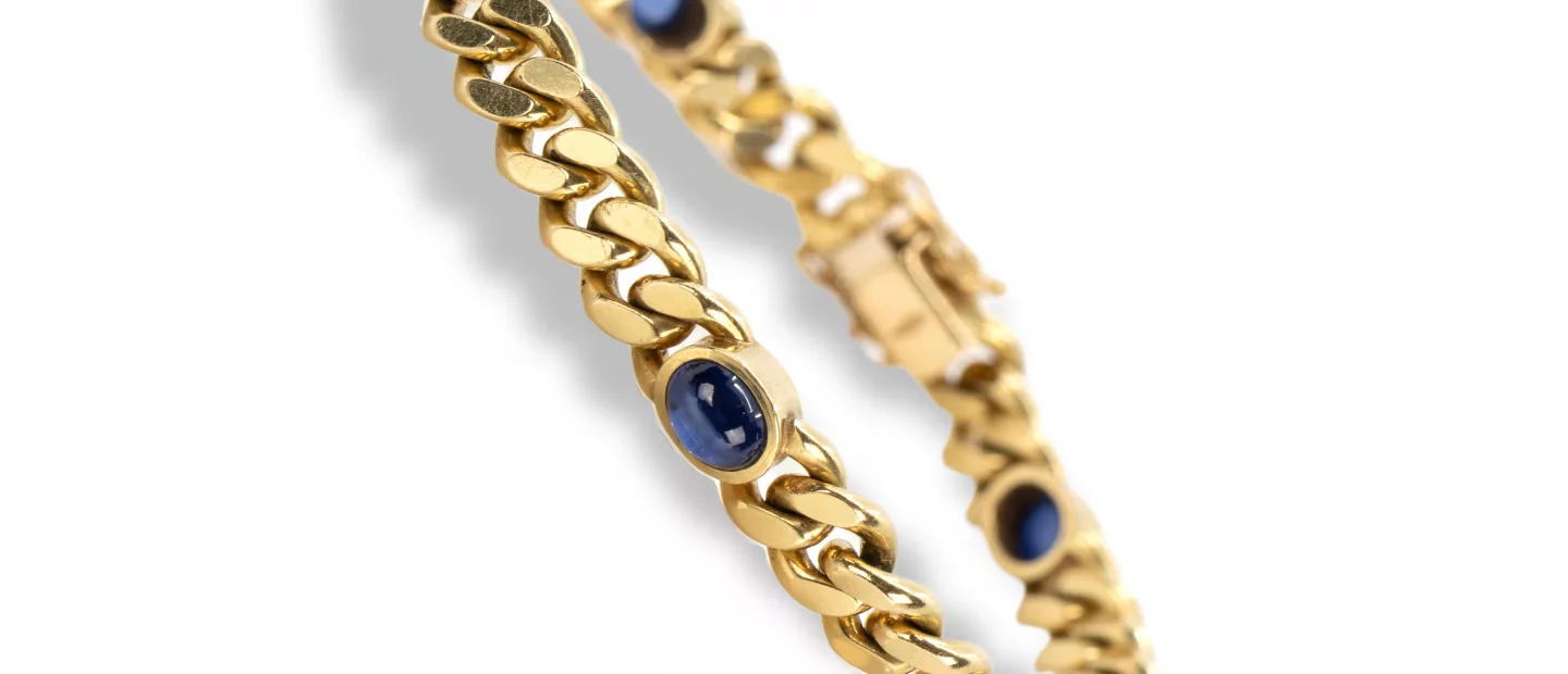Panzerarmband mit Saphircabochons: 750 Gelbgold, punziert, 5 Saphire im Cabochonschliff, gesamt ca. 4,00 ct, Länge 19 cm, Gewicht ca.