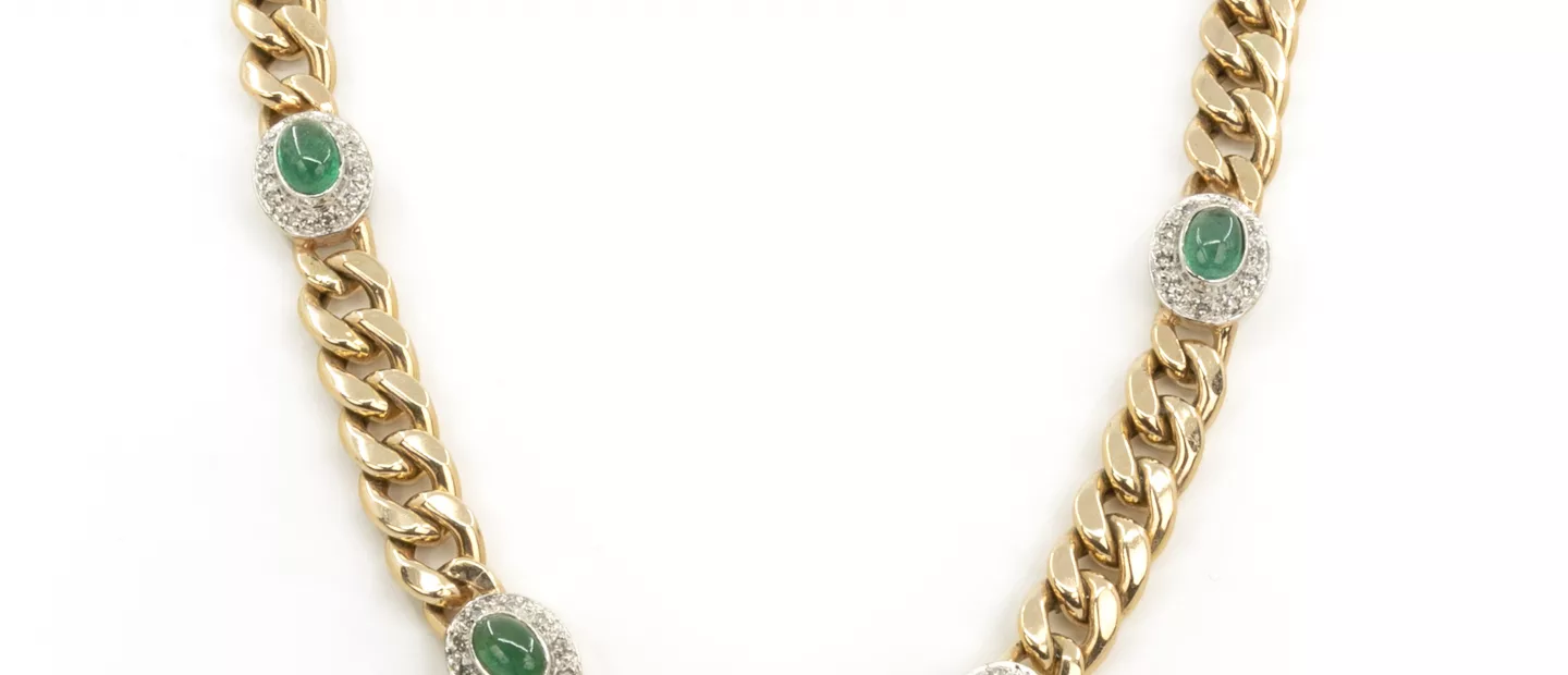 Panzerkette mit Smaragdcabochons: 585 Gelb- und Weißgold, punziert, 40 Diamanten im Brillantschliff, gesamt ca. 0,40 ct, 4 Smaragde im...