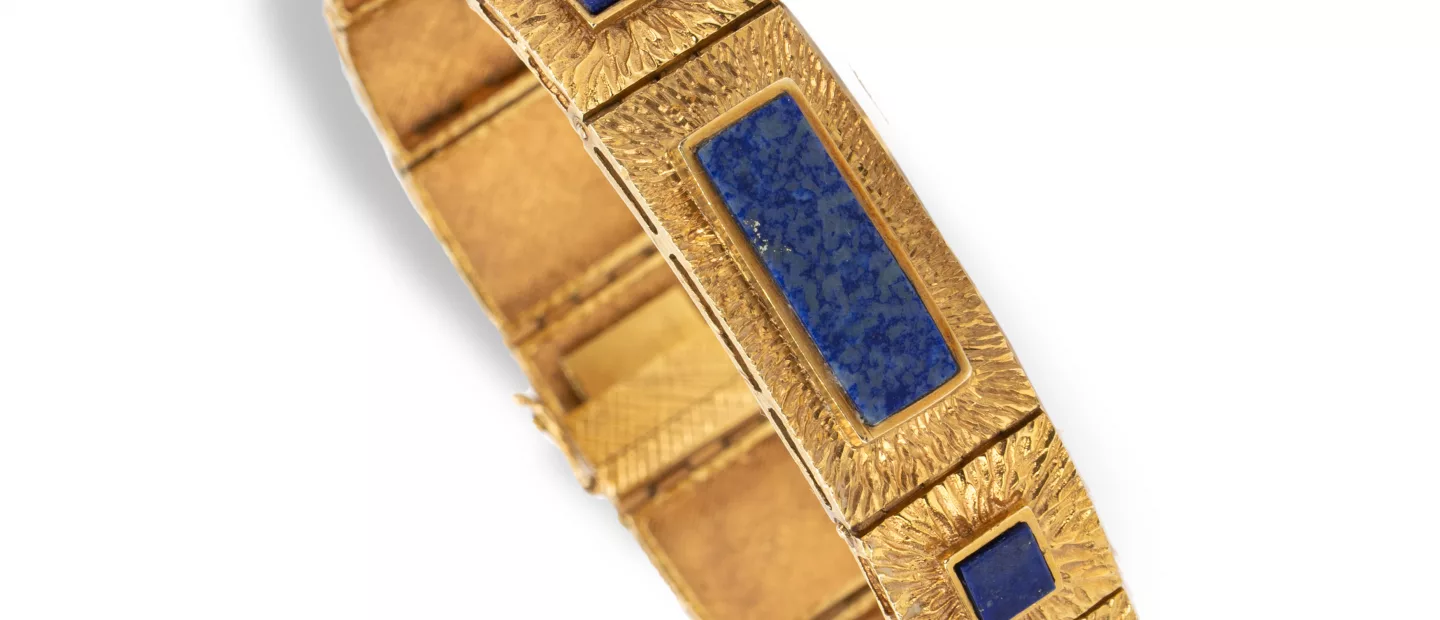 Lapislazuliarmband: 585 Gelbgold, punziert, 14 quadratische und ein rechteckiger Lapislazuli, 5,1 x 5,2 mm und 19,8 x 6,9 mm, Länge...