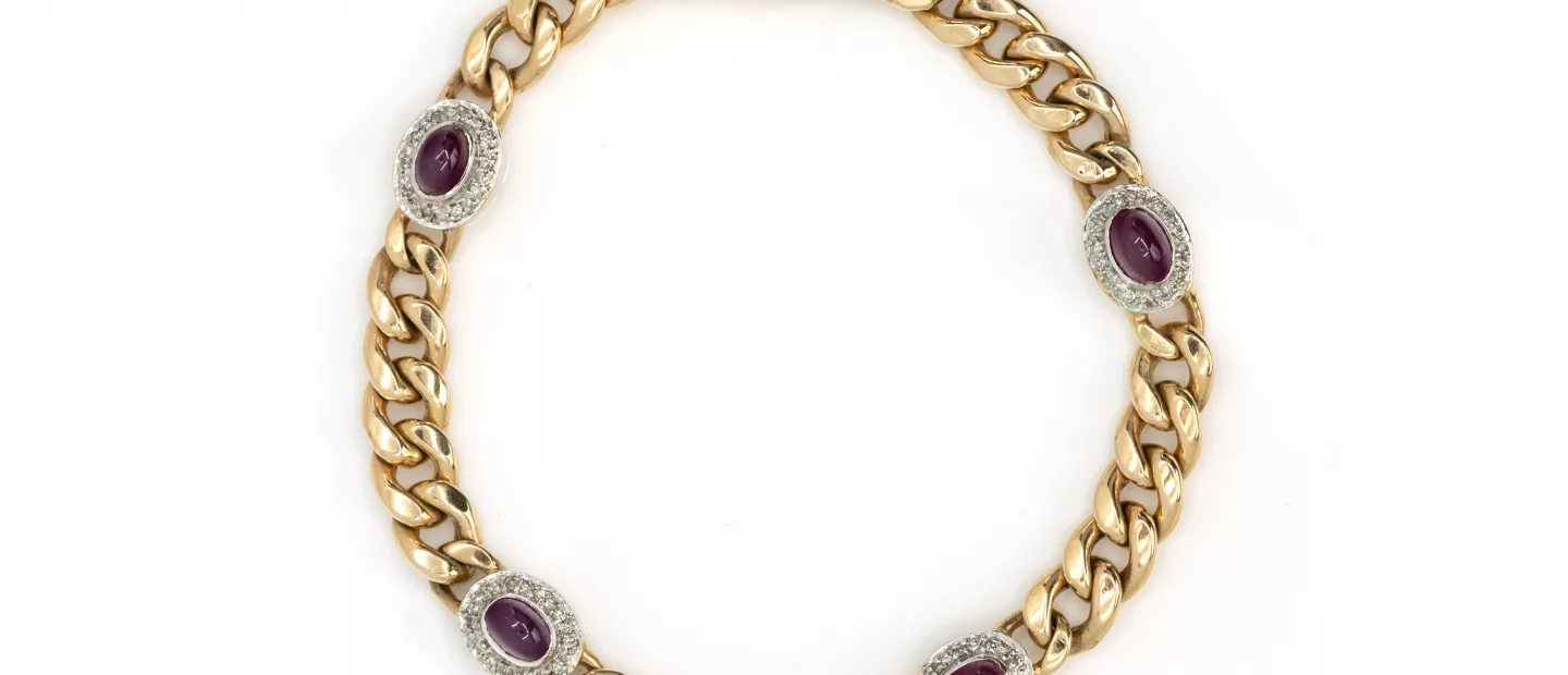 Panzerarmband mit Rubincabochons: 585 Gelb- und Weißgold, punziert, 40 Diamanten im Brillantschliff, gesamt ca. 0,40 ct, 4 Rubine im...