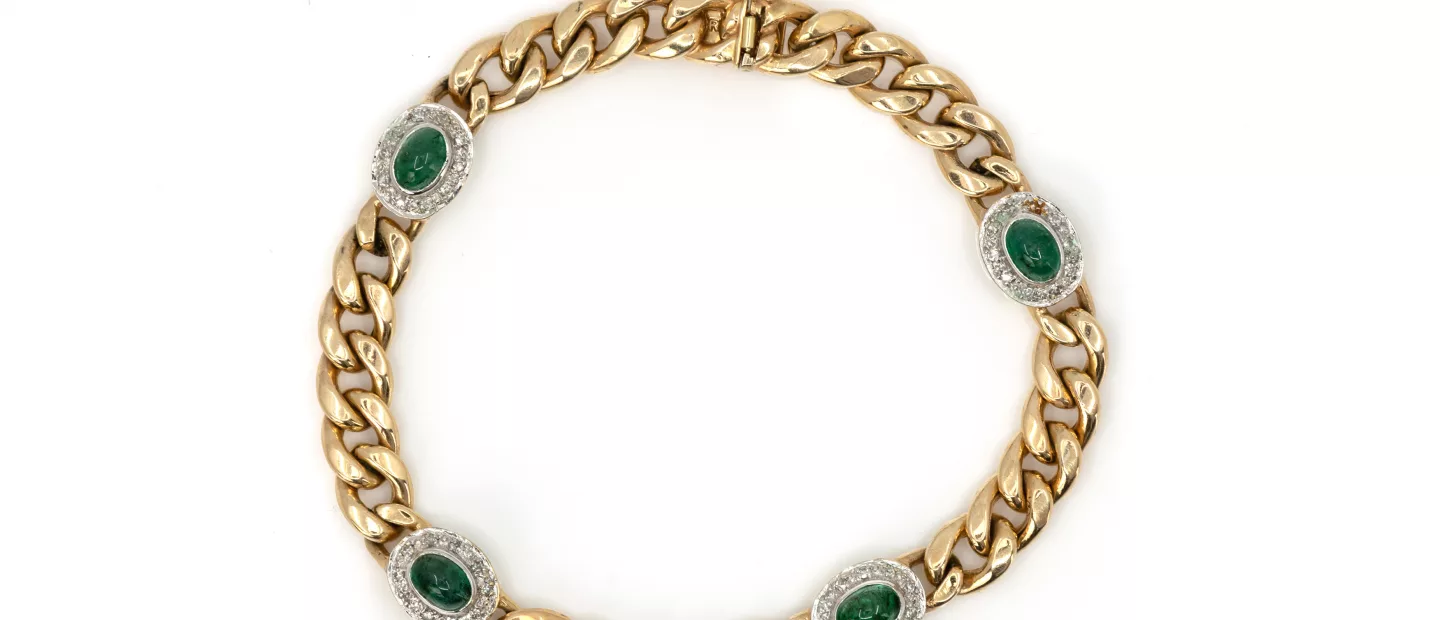 Panzerarmband mit Smaragdcabochons: 585 Gelb- und Weißgold, punziert, 40 Diamanten im Brillantschliff, gesamt ca. 0,40 ct, 4 Smaragde...