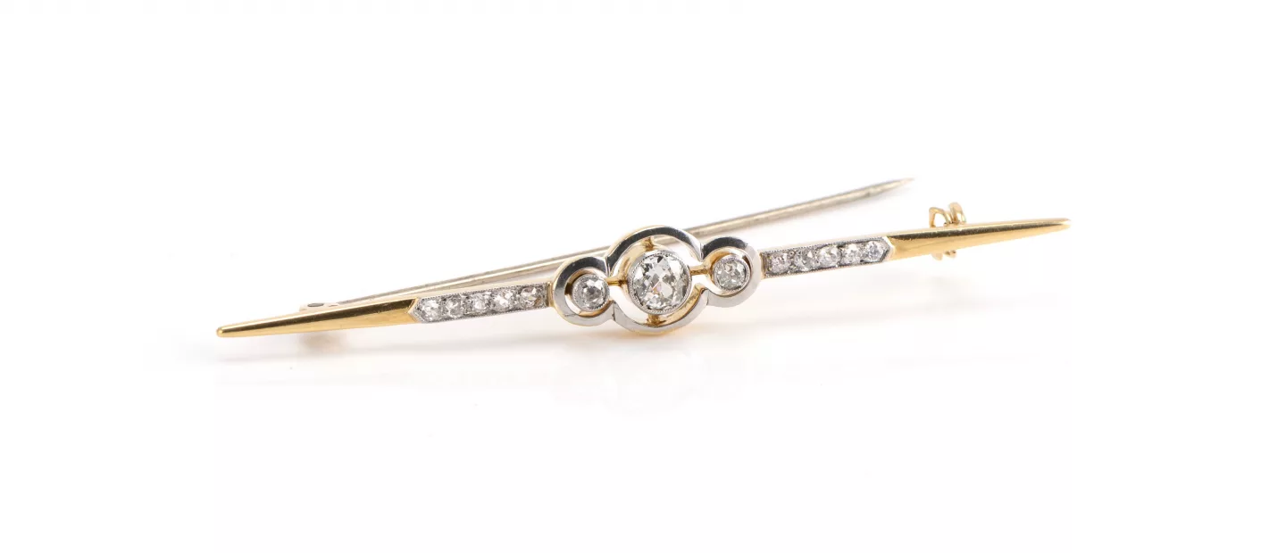 Stabbrosche mit Diamantbesatz: 750 Gelb- und Weißgold, punziert, 3 Diamanten im Altschliff und 13 Diamantrosen, gesamt ca. 0,70 ct, H,...