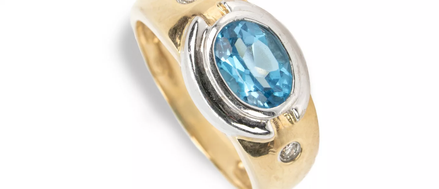 Blautops-Diamantring: 585 Gelb- und Weißgold, punziert, 2 Diamanten im Brillantschliff, H, vs, ovaler, facettierter Blautopas, ca....
