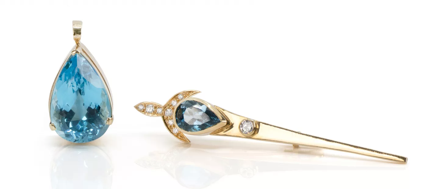 Topasbrosche und Anhänger: 2-tlg., Anhänger 585 Gelbgold, punziert, Brosche 750 Gelbgold, geprüft, Brosche mit 9 Diamanten im...