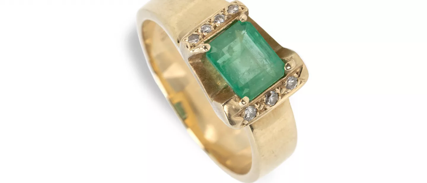 Smaragd-Diamantring: 585 Gelbgold, punziert, 7 Diamanten im Achtkantschliff, gesamt ca. 0,10 ct, H, vs-si, Smaragd im Smaragdschliff,...