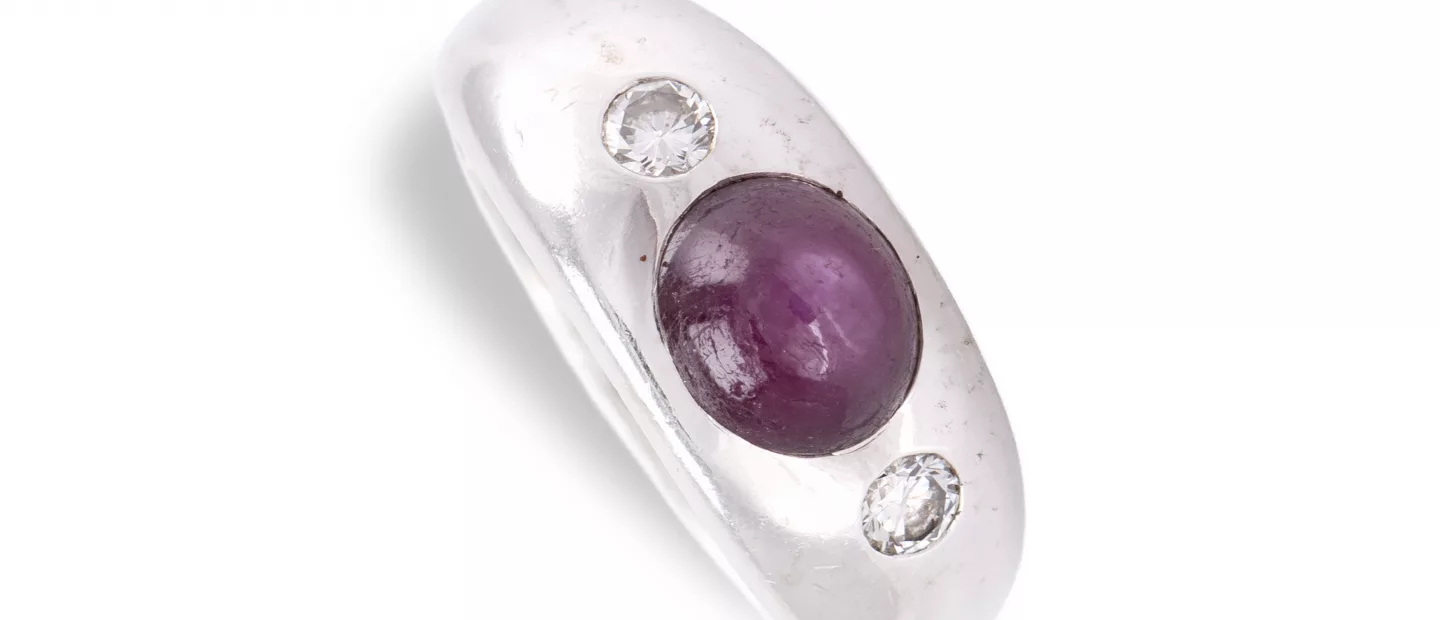 Ring mit Sternrubin: 585 Weißgold, punziert, 2 Diamanten im Brillantschliff, gesamt ca. 0,15-0,20 ct, I-J, vs, zentraler Sternrubin im...