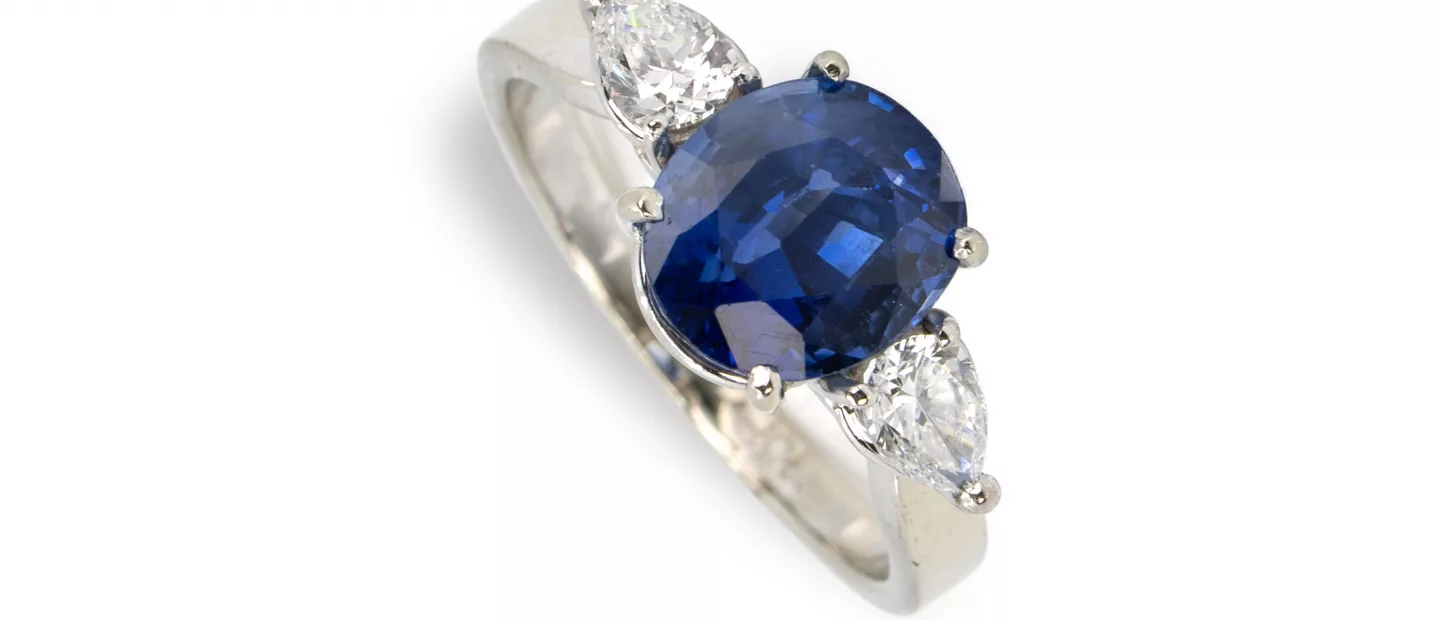 Saphir-Diamantring: 750 Weißgold, punziert, 2 Diamanten im Tropfenschliff, gesamt ca. 0,50 ct, G, vvs, zentraler Saphir im...