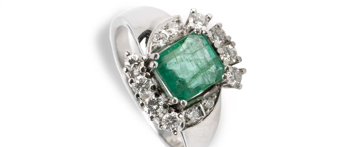 Smaragd-Diamantring: 750 Weißgold, punziert, 12 Diamanten im Brillantschliff, gesamt ca. 0,32 ct, G-H, vs, Smaragd im Smaragdschliff,...