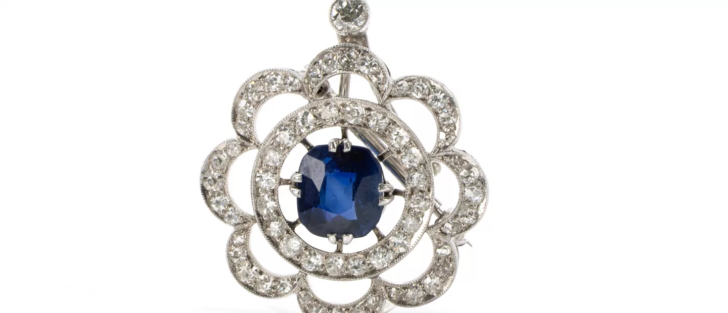 Saphir-Diamantbrosche: 750 Weißgold, geprüft, 62 Diamanten im Alt- und Achtkantschliff, gesamt ca. 1,15 ct, H, vs-pi1, oval...