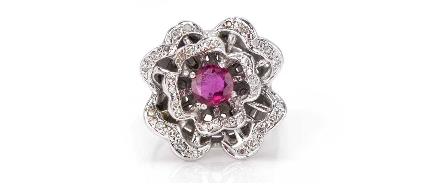 Diamant-Rubin-Blütenring: 750 Weißgold, geprüft, Diamanten im Achtkantschliff, gesamt ca. 0,50 ct, H, vs-si, zentraler, rund...