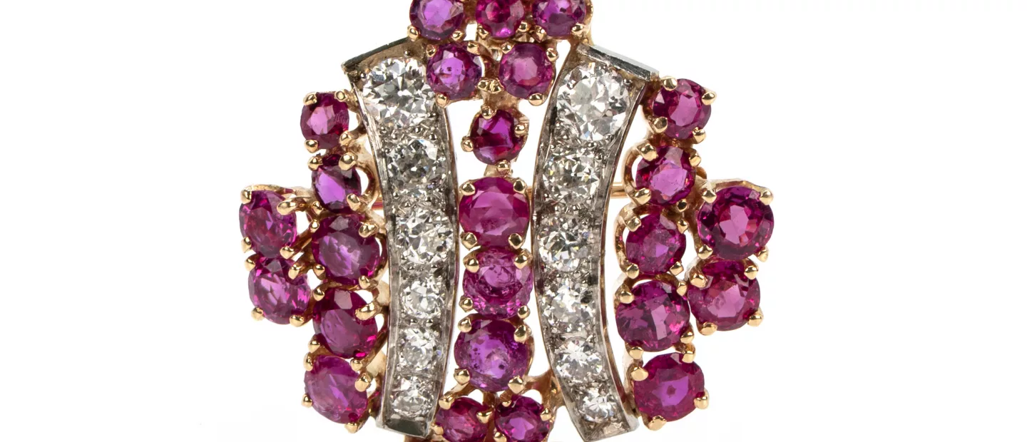 Rubin-Diamantbrosche: 585 Gelb- und Weißgold, geprüft, 12 Diamanten im Brillantschliff, gesamt ca. 1,30 ct, H, vs-pi, 28 rund...