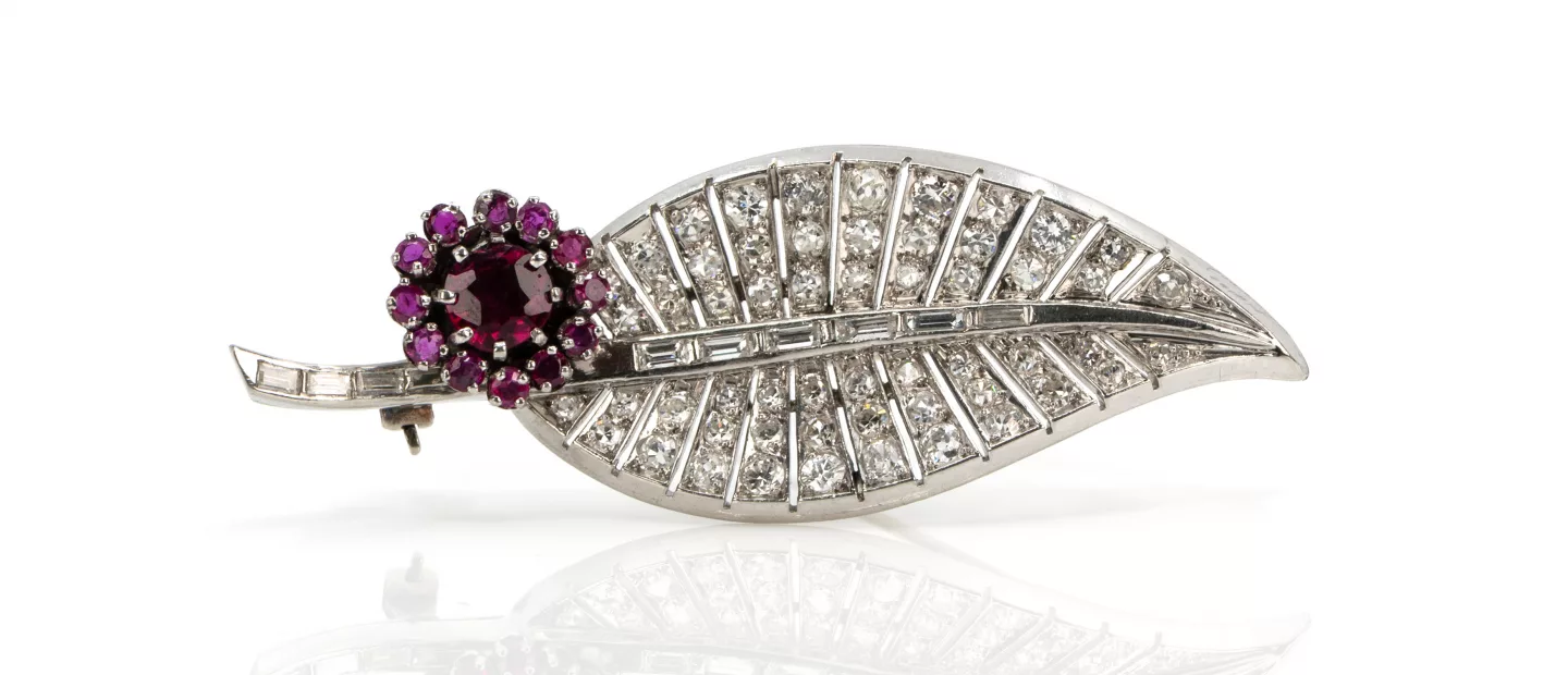 Diamant-Rubinbrosche in Blattform: 750 Weißgold, geprüft, 54 Diamanten im Achtkant- und Altschliff, sowie 3 Diamanten im...
