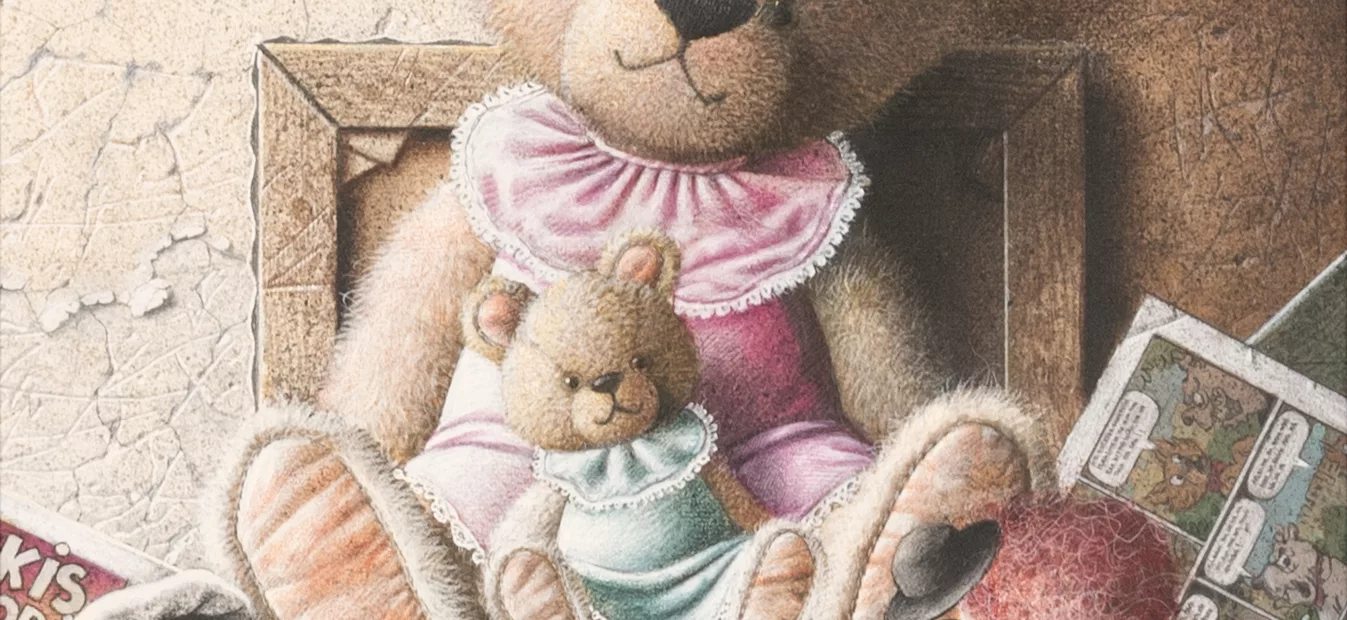 Wahed Khakdan (1950 Teheran): Stillleben mit Teddybär, Clown und Ente, Mischtechnik auf Platte, 44 cm x 32 cm Sichtmaß, signiert, 96...