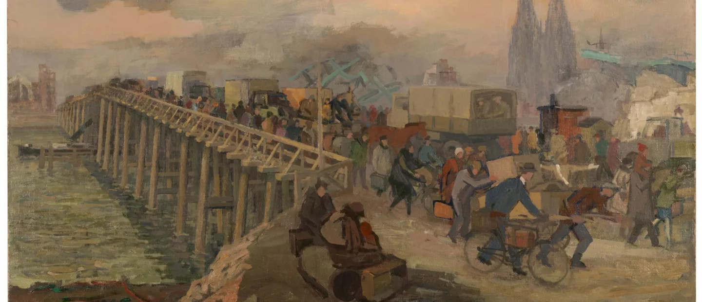 Bernt Rösel (1912 Essen): Stadtansicht von Köln, Kriegsende 1945, Öl auf Spanplatte, 51 cm x 75 cm Werkmaß, partiell craquel