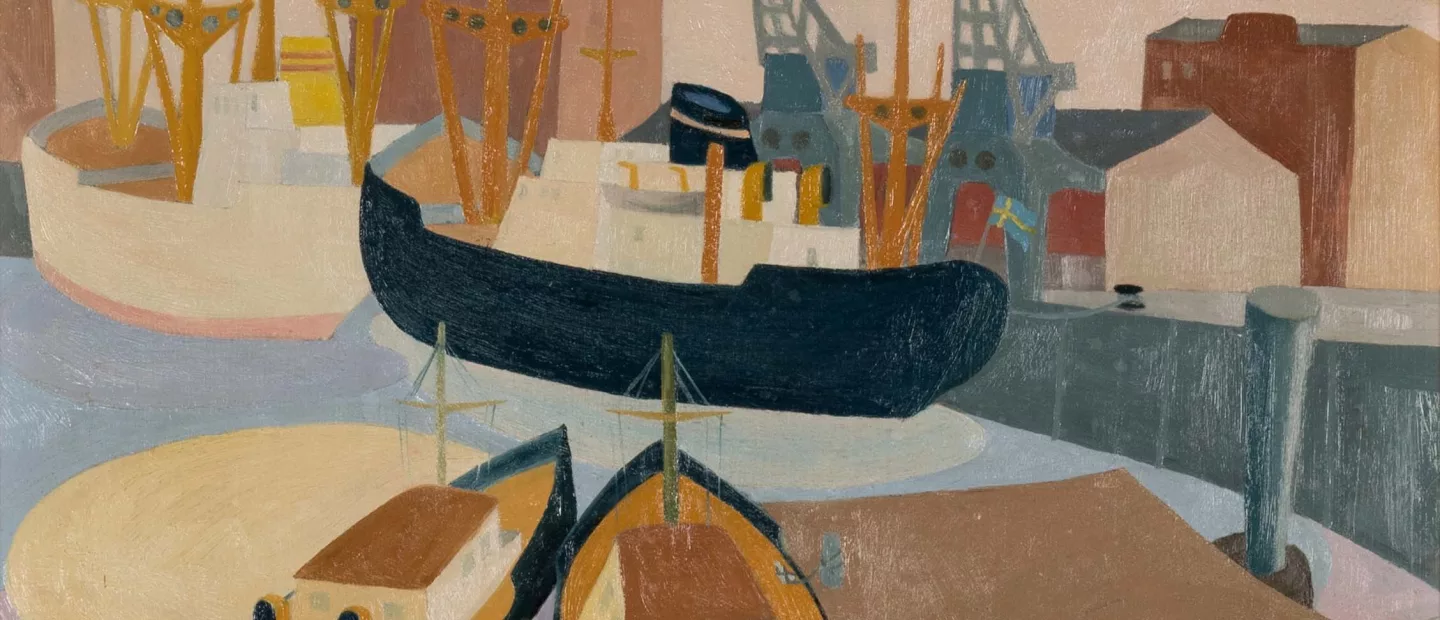 Franz Josef Lipensky (1932 Böhmisch-Leipa - 2023 Köln): Schiffe im Duisburger Innenhafen, Acryl auf Hartfaserplatte, 51 cm x 61 cm...
