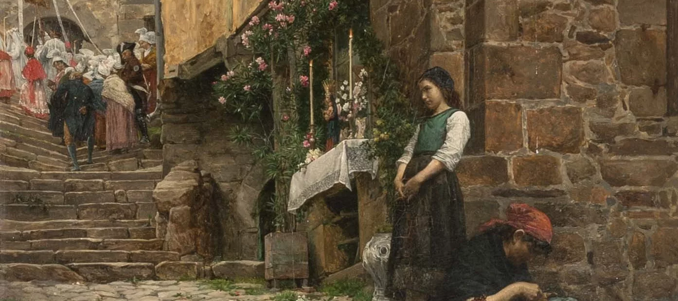 Étienne Prosper Berne-Bellecour (1838 Boulogne-sur-Mer, Frankreich - 1910 Paris): Kirchliche Prozession, Öl auf Holz, 55 cm x 42 cm...