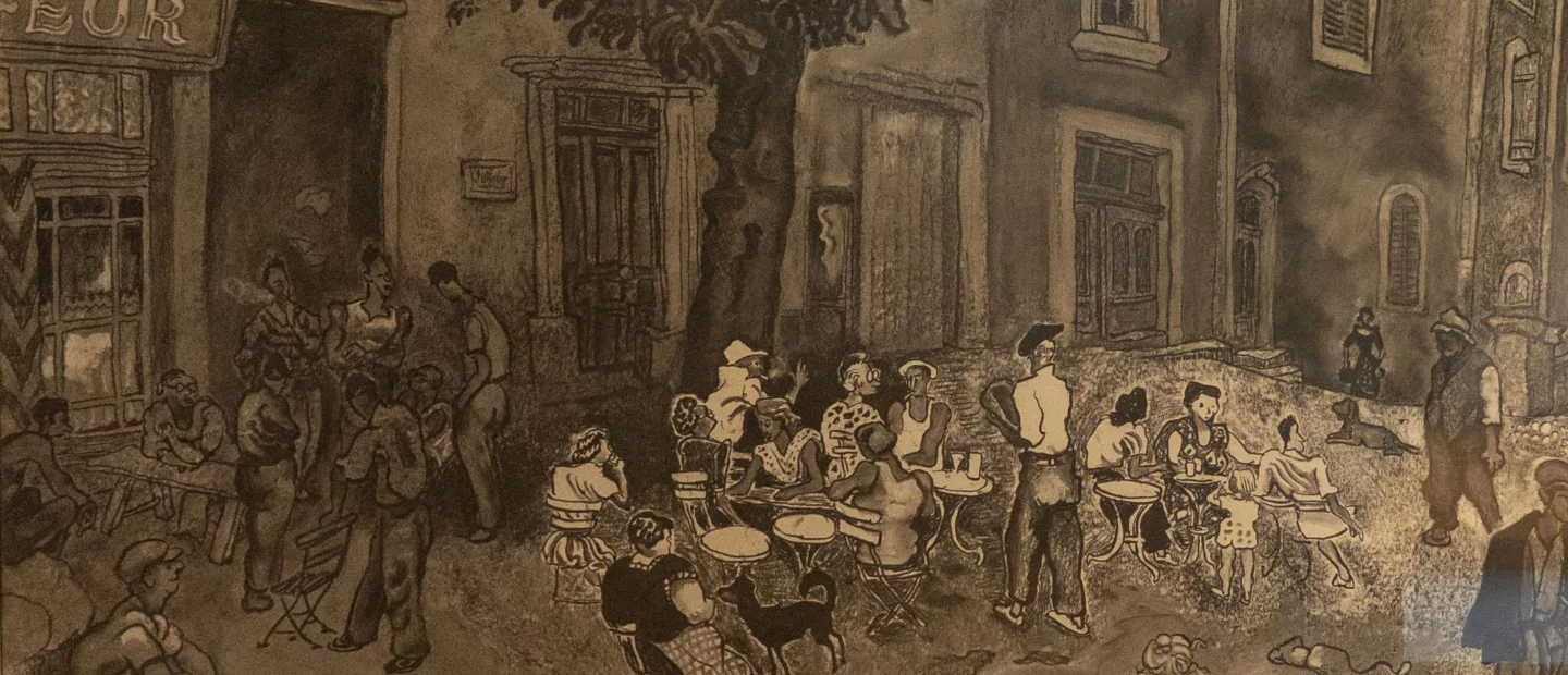 Otto Pankok (1893 Mülheim an der Ruhr - 1966 Wesel): Dorfcafé in Südfrankreich, Kohlezeichnung auf Papier, 100 × 150 cm Blattmaß,...