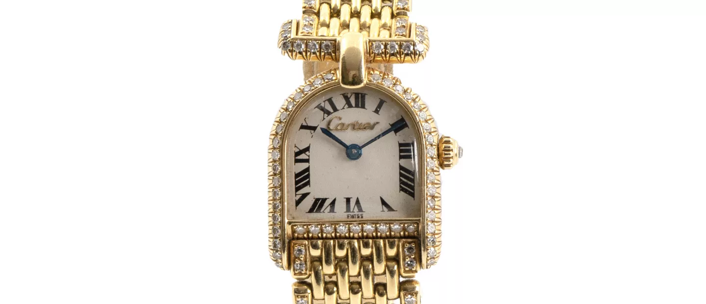 Cartier Calandre: Quarzwerk, Gehäuse und Armband besetzt mit Brillanten, Brillantkrone, Gehäuse-Nr. 660320742, Gehäuse 18k Gelbgold,...