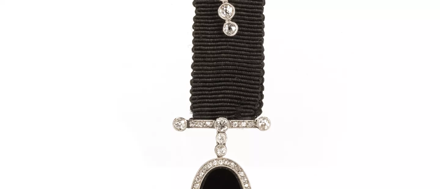 Art déco Chatelaine-Uhr: Um 1925, Handaufzug, Gehäuse Platin, verso Onyxplättchen, Krone mit Onyxcabochon, insgesamt 68 Diamanten im...