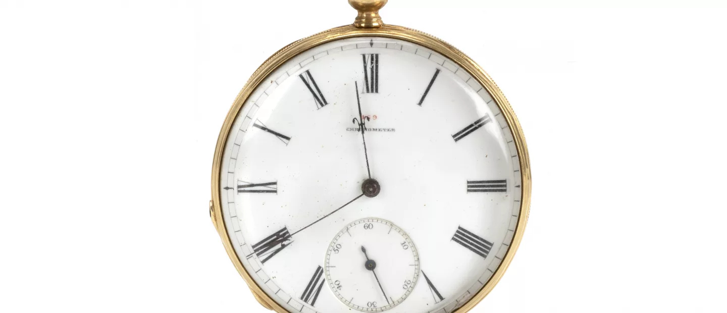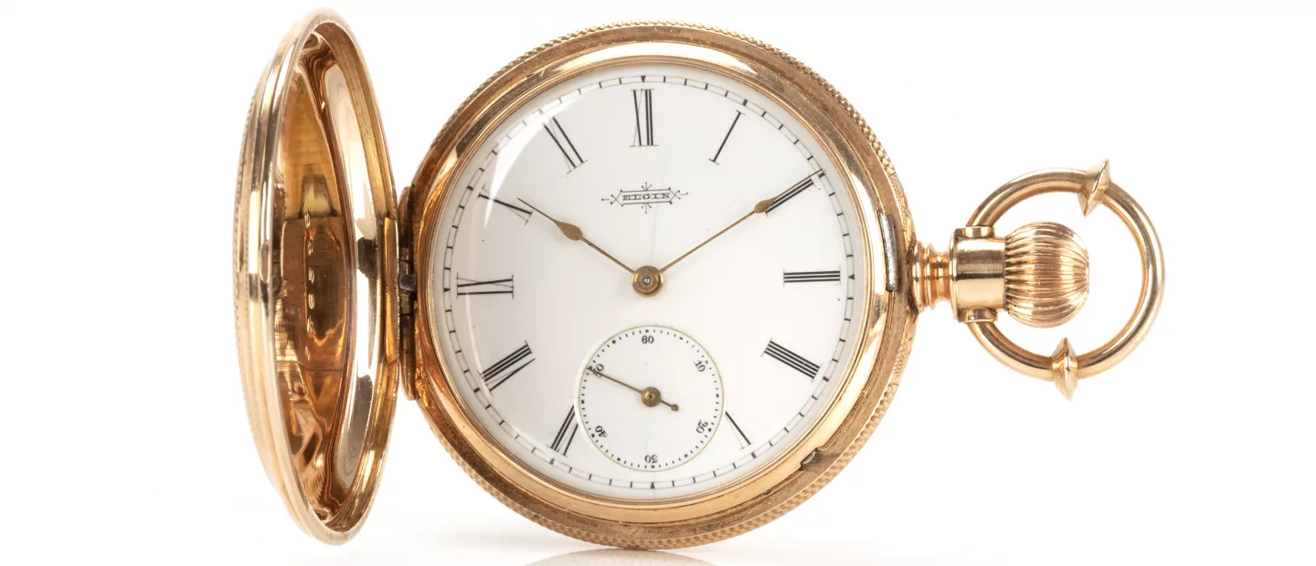 Elgin Rotgold-Savonnette: um 1850, Kronenaufzug, Gehäuse mit gravierter Landschaft, Emaille-Zifferblatt mit römischen Ziffern, kleine...