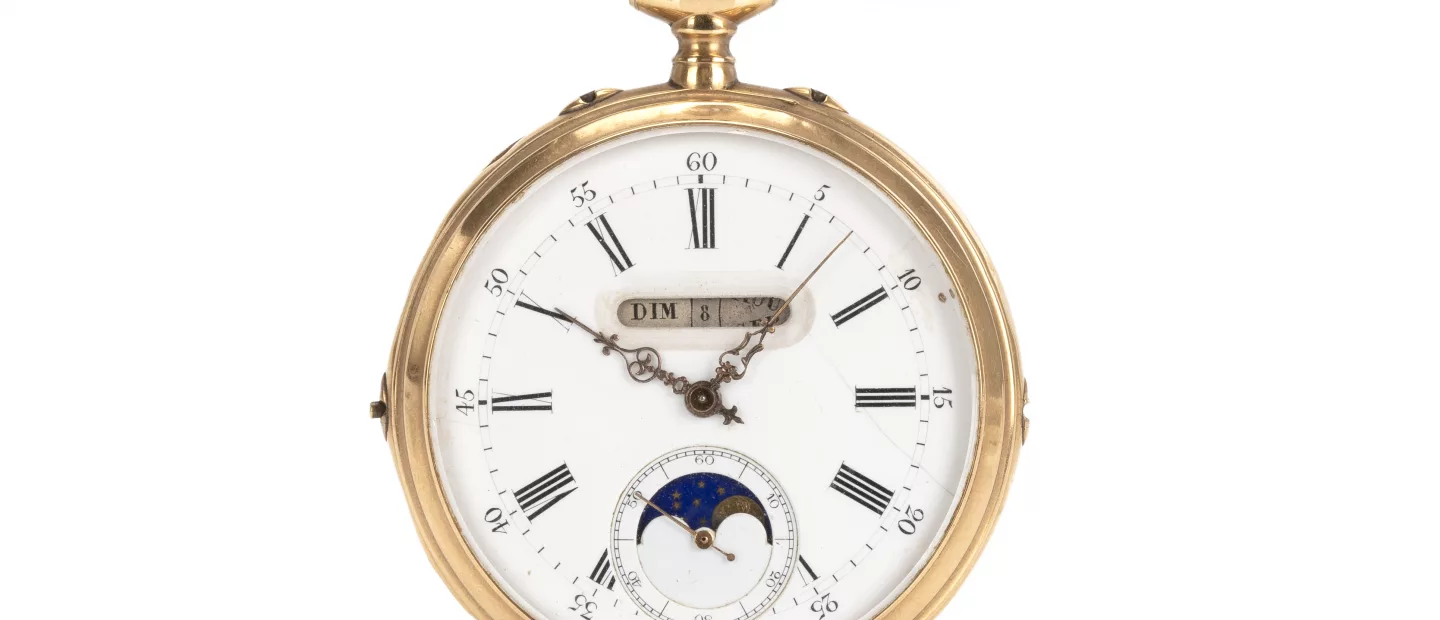 Rotgold-Savonnette mit Mondphasenkalender: Kronenaufzug, Emaille-Zifferblatt, französische Kalenderindikation, Mondphase, Gehäuse-Nr....