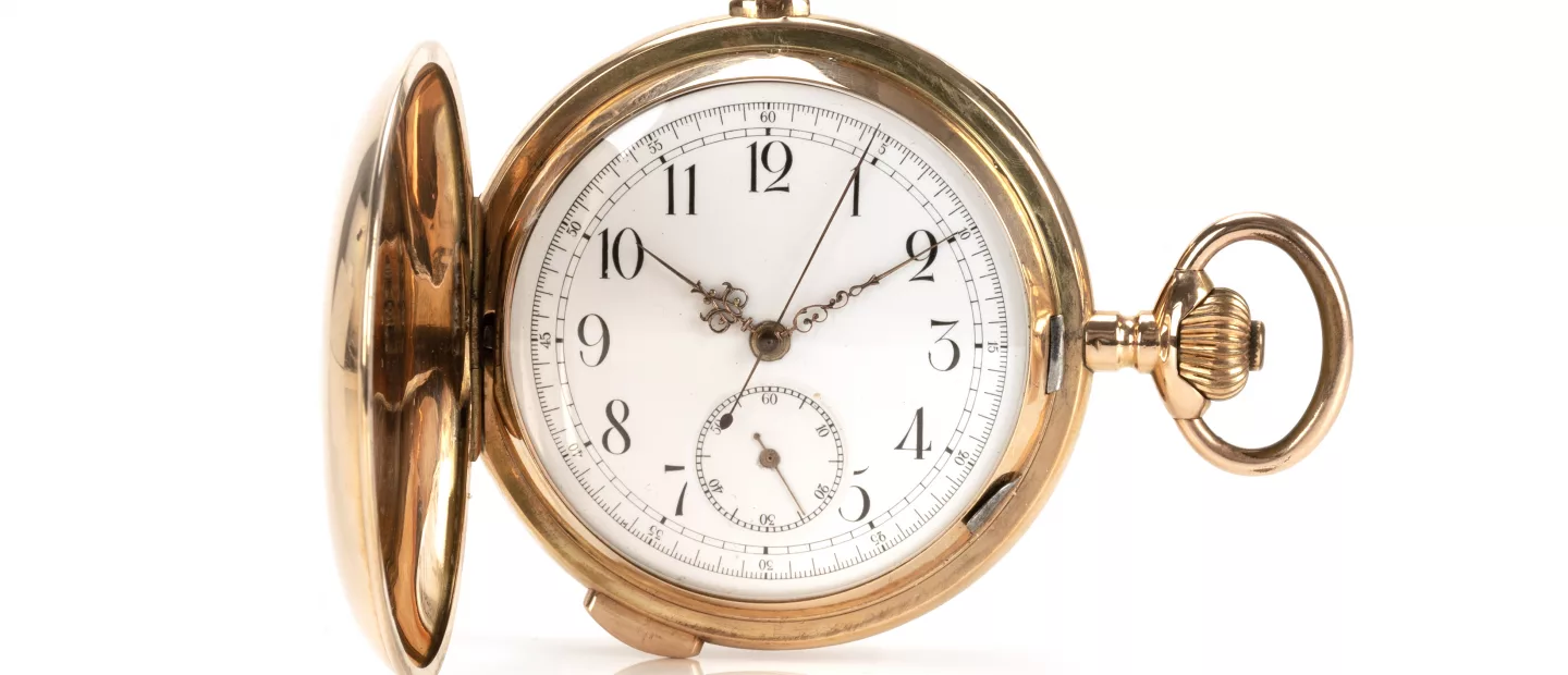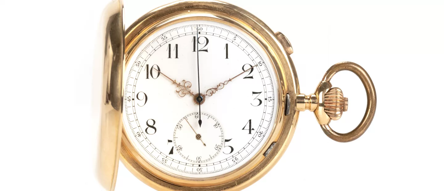 Rotgold-Savonnette mit Chronograph: Kronenaufzug, Zeigerstellung über Hebel, Emaille-Zifferblatt mit arabischen Ziffern, kleine...