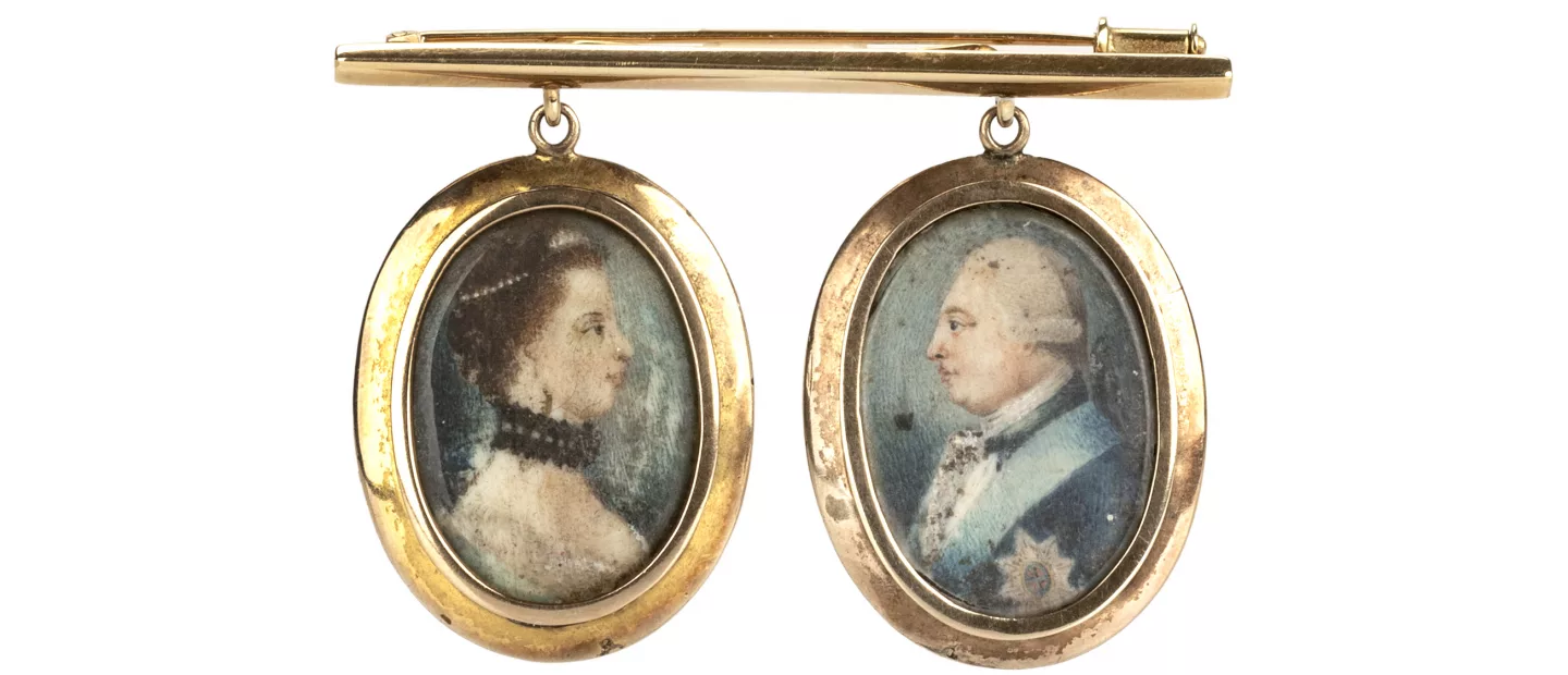 Porträt-Brosche King George III und Queen Charlotte: Broschierung 585 Gelbgold, punziert, später ergänzt, Anhänger 585 Gelbgold,...
