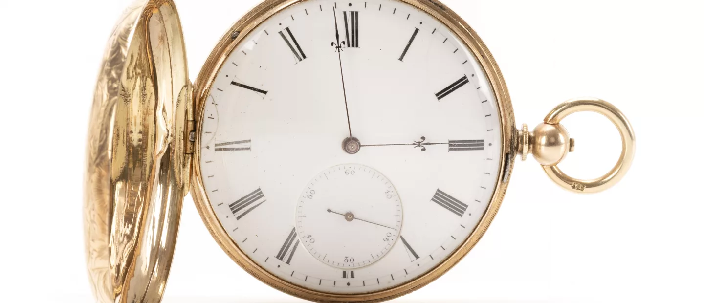 Elgin Rotgold-Savonnette: um 1850, Kronenaufzug, Gehäuse mit gravierter Landschaft, Emaille-Zifferblatt mit römischen Ziffern, kleine...