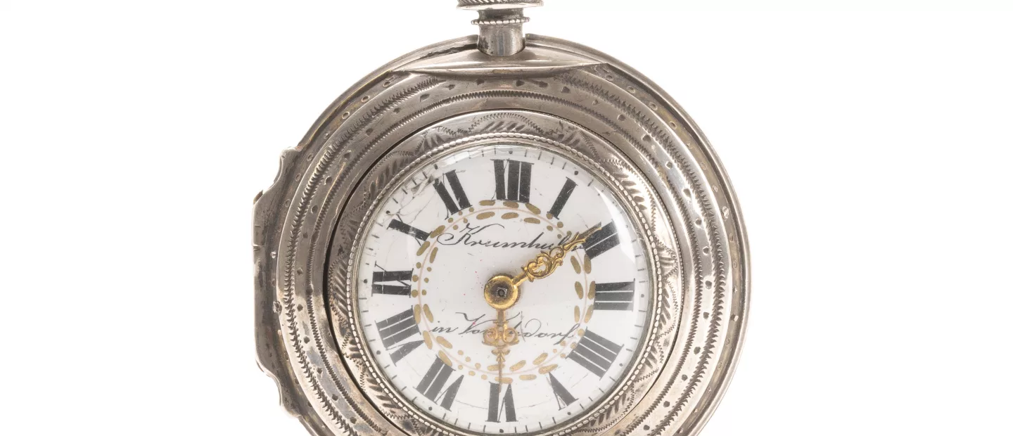 Joseph Krumhuber in Vorchdorf Spindeltaschenuhr mit Übergehäuse: Ende 18. Jh., Schlüsselaufzug, Emaille-Zifferblatt mit römischen...