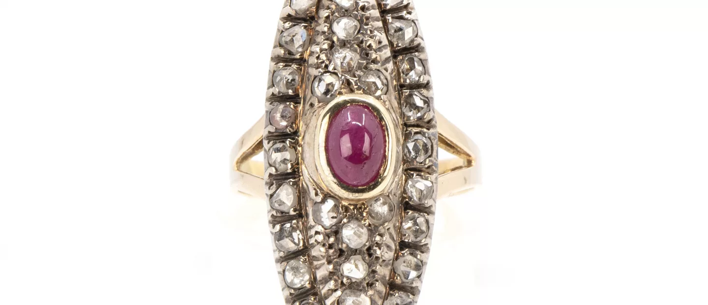 Diamant-Schiffchenring: Ende 19. Jh., 750 Gelbgold, geprüft, 35 Diamanten im Rosenschliff, gesamt ca. 0,70 ct, I-J, pi, mittig ein...