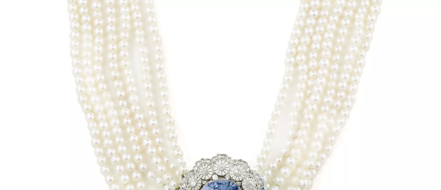 Perlencollier mit Saphir-Diamantanhänger: Um 1900, Mittelstück 585 Weißgold, geprüft, Schließe später ergänzt, 585 Weißgold,...