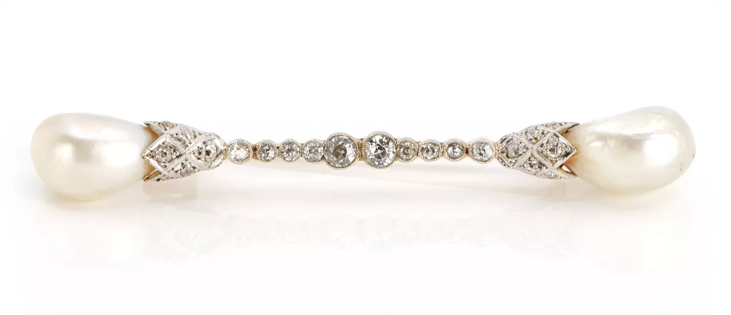 Diamant-Perlbrosche: Um 1900, 585 Gelb- und Weißgold, geprüft, 22 Diamanten im Altschliff, gesamt ca. 0,90 ct, I-J, si, Länge 7,4 g,...