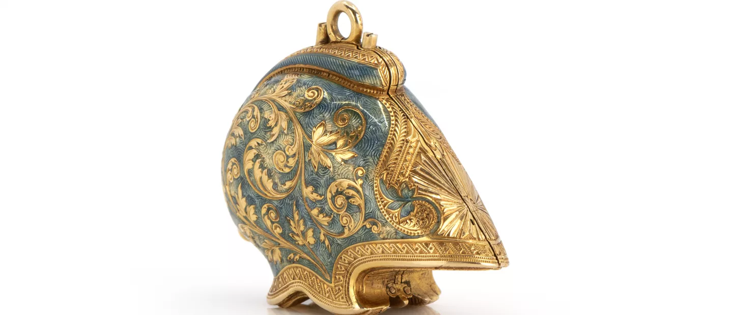 Emaille-Anhänger-Taschenuhr: Gehäuse 750 Gelbgold, geprüft, Zwischendeckel Gelbgold, 2255 nummeriert, Gehäuse in Form eines antiken...
