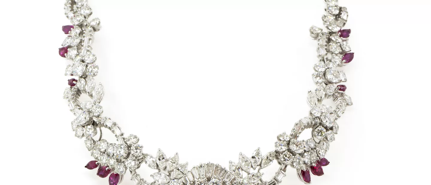 Diamant-Rubincollier: 950 Platin, punziert, zentraler Diamant im Brillantschliff, 4,03 ct, J, vvs2, Proportionen gut, Symmetrie gut,...