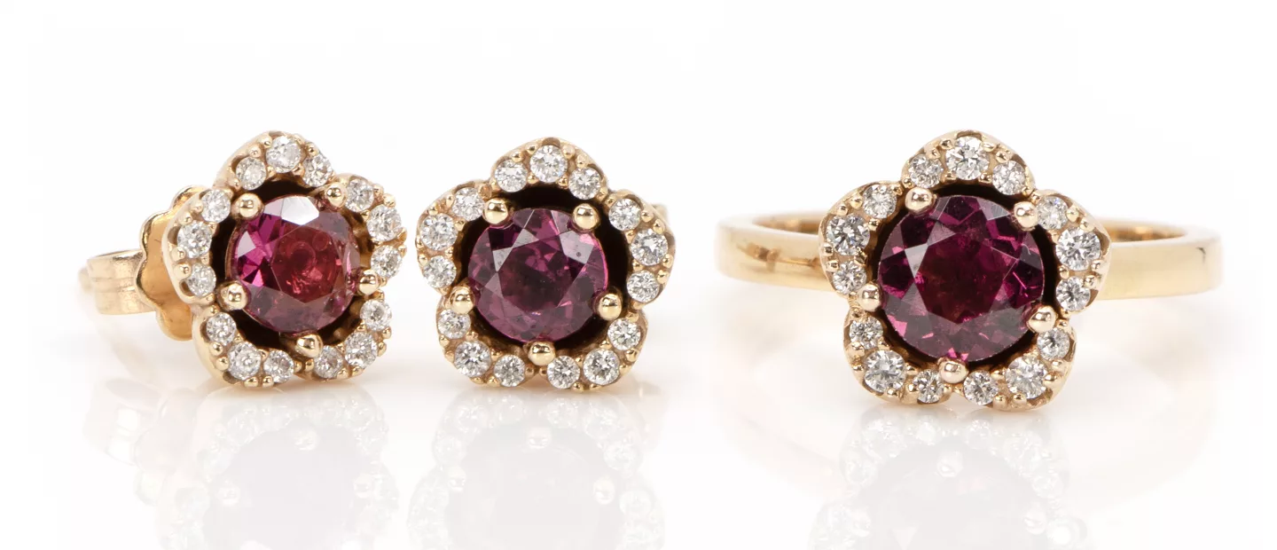 Turmalin-Diamant-Schmuckset: 3-tlg., 585 Roségold, punziert, Ohrstecker und Ring mit 45 Diamanten im Brillantschliff, gesamt ca. 0,95...