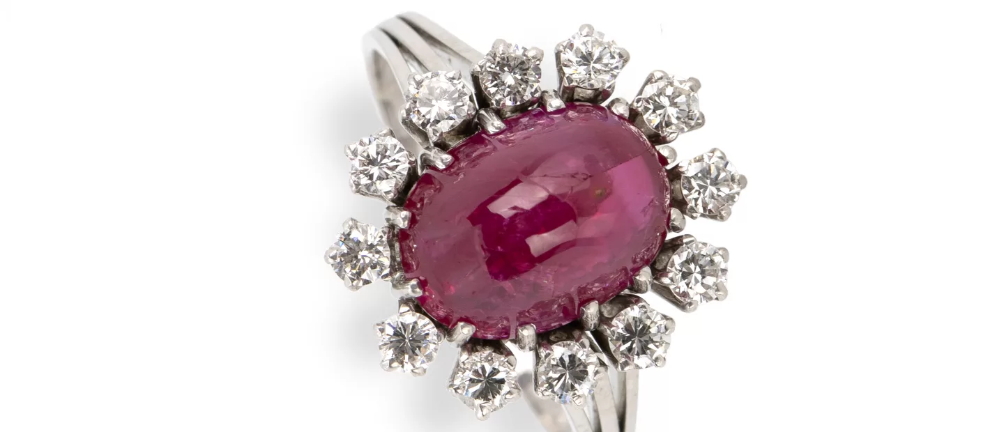 Rubin-Diamantring: 750 Weißgold, punziert, 12 Diamanten im Brillantschliff, gesamt ca. 0,62 ct, H, vvs, Rubincabochon ca. 5,83 ct, RW...