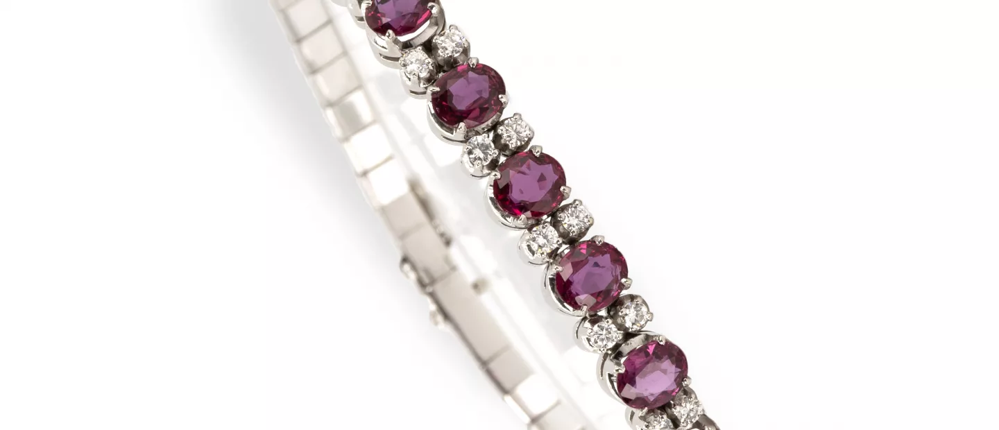 Rubin-Diamantarmband: 750 Weißgold, punziert, 16 Diamanten im Brillantschliff, gesamt ca. 0,54 ct, H, if, 7 Rubine im Ovalschliff,...