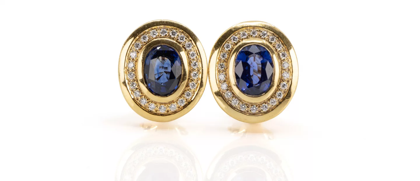 Gübelin Saphir-Diamantohrclips: Gübelin, Schweiz, 750 Gelbgold, punziert, dazu Markenpunze, Diamanten im Brillantschliff, jeweils 1...