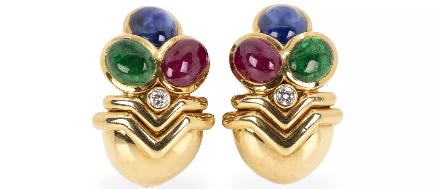 Edelstein-Diamantohrclips: 750 Gelbgold punziert, jeweils 1 Diamant im Brillantschliff, gesamt ca. 0,10 ct, je ein Rubin, ein Saphir...