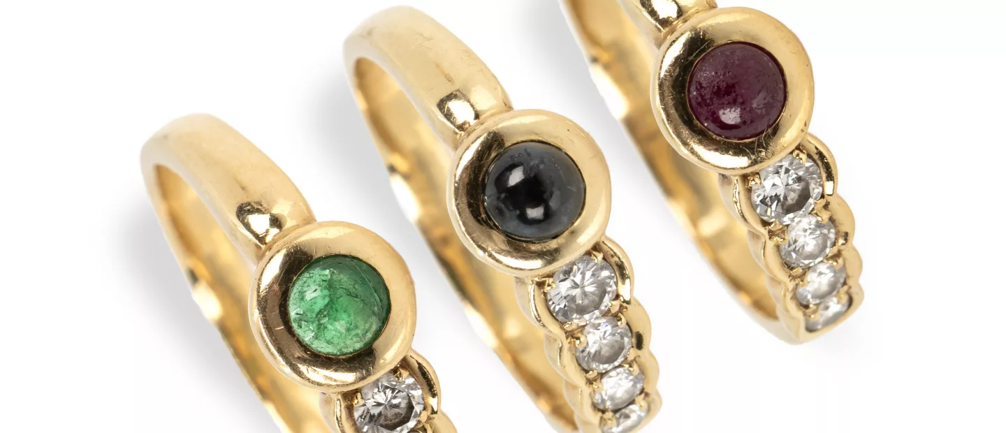 Diamant-Edelstein-Ringset: 3-tlg., 750 Gelbgold, punziert, je Ring 4 Diamanten im Brillantschliff, jeweils ca. 0,30 ct, Diamanten...