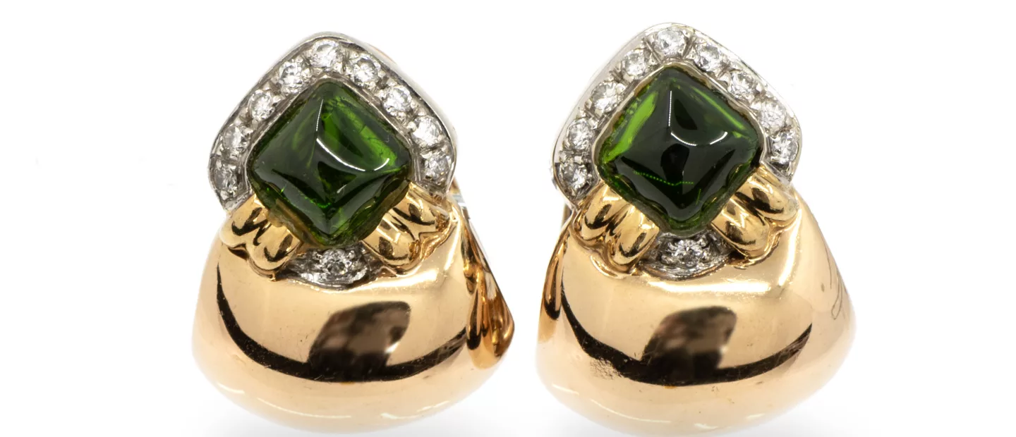 Turmalin-Diamantohrclips: 750 Rotgold, punziert, dazu Markenpunze Marco Valente, Italien, jeweils 10 Diamanten im Brillantschliff,...